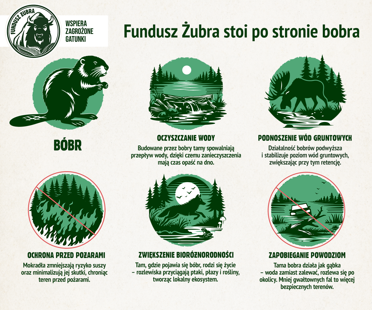 Korzystają z tego lokalne ekosystemy, zamieszkiwane przez niezwykle cenne gatunki roślin i zwierząt. Wiele z nich, jak choćby wilk, niedźwiedź czy ryś, to gatunki zagrożone, które od lat wspiera Fundusz Żubra. W tym roku wraz z przyrodnikami Fundusz przygląda się bliżej bobrom i roli, jaką odgrywają dla ekosystemów. Zachęca też, by na bobra spojrzeć przychylnym okiem – nie jak na szkodnika, ale sojusznika
